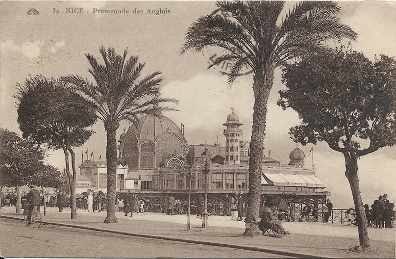 • Situation au début du XXᵉ siècle : vers 1900-1914, la Promenade des Anglais était devenue un large boulevard maritime bordé d’hôtels de luxe, de villas et de jardins. C’était l’un des lieux de sociabilité majeurs de la Côte d’Azur.